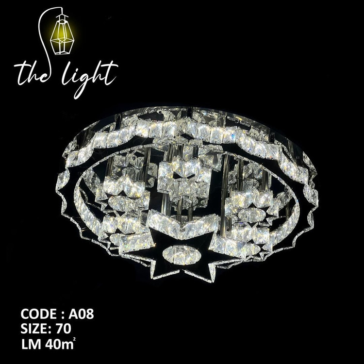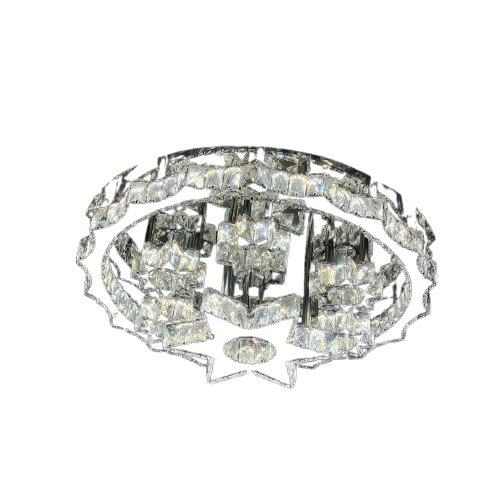 طراحی خورشید و ستاره: طراحی خیرهکننده با یک دایره کریستالی بزرگ (سایز ۷۰) به همراه ستارههای آویز (۴۰ و ۱۰ سانتیمتری) که درخشش و عمق فوقالعادهای به سقف میبخشد.